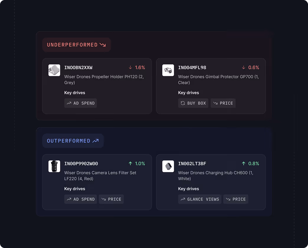 Continuously monitors product signals — detecting anomalies and diagnosing root causes across key performance drivers such as Buy Box, pricing, inventory, advertising, and more.